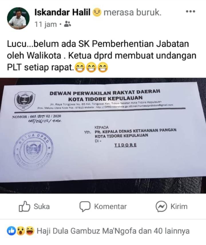 BORERO.ID – Salah Satu Kepala Dinas dilingkup pemerintah kota Tidore kepulauan merasa terkejut dengan undangan yang dilayangkan sekretariat DPRD yang menuliskan PLT, Kejadian tersebut sudah berulang kali terjadi.