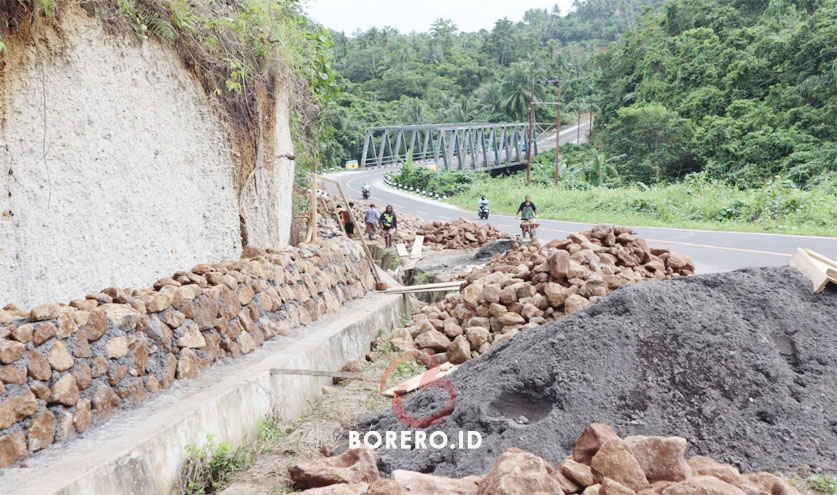 Pekerjaan proteksi pemasangan batu atau tebing di ruas jalan nasional di Tidore Kepuluan. (Foto, melon/borero.id)
