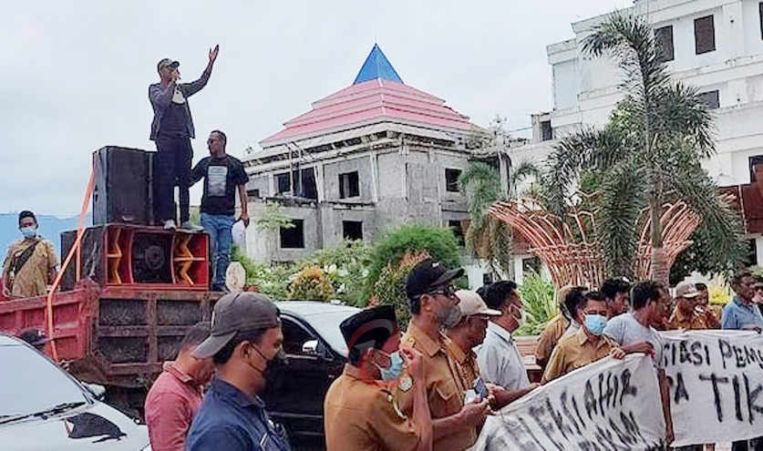 BORERO.ID SOFIFI– Sejumlah Kepala Desa (Kades) yang tergabung dalam Asossiasi Pemerintah Desa (Apdesi) di dataran Oba, Tidore Kepuluan, Provinsi Maluku Utara (Malut) menggelar unjuk rasa di Kantor DPRD Provinsi Malut dan Kantor Gubernur Malut, Selasa (28/12/2021). Aksi tersebut terkait pembangunan infrastrukur dan jalan daratan Oba, serta disiplin ASN di Sofifi.
