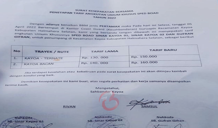 Diketahui, tarif spedboat Gufran Gifran  dan Sinar Kayoa 01-02  Kayoa -Ternate Rp 130.000 naik menjadi Rp.150.000.  Sementara kayoa-Bacan 140.000 naik menjadi Rp.160.00.  Hal itu termuat dalam surat kesepakatan bersama penetapan tarif angkutan umum khusus speedboat Tahun 2022.  Dalam surat ini dituliskan bahwa dengan adanya kenaikan harga BBM jenis partamax maka pada hari Selasa, 5 April 2022 bertempat di kantor coast guard (kesahbandraan) Gurapin, Kecamatan Kayoa, Kabupaten Halsel. Kami yang bertanda tangan menyepakati tarif angkutan umum khususnya speedboat Sinar Kayoa 01, Sinaar Kayoa 02, dan Gufran Gifran.