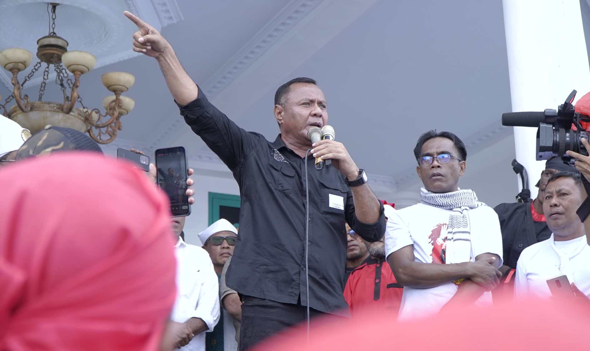 Walikota Tidore Kepulauan Muhammad Sinen saat berbicara dihadapan masa aksi di halaman Kedaton Kesultanan Tidore